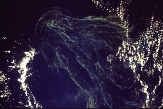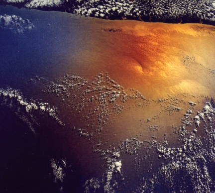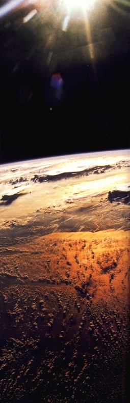 | Earth VI The Indian Ocean. The coast of Madagaskar can be seen at the upper edge. The nice colors are due to the pollution in the air caused by human hand. |