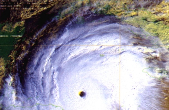 | Earth IX The hurrican Mitch. He brought death and destruction to the people in Honduras, Nicaragua and parts of the other states in middle america at the end of October 1998. He belongs to the four biggest hurricans in our century. On the left side you can the the Mexican peninsula Yacután. The eye´s diameter is 35 km, the top speed around it is about 300 km. |